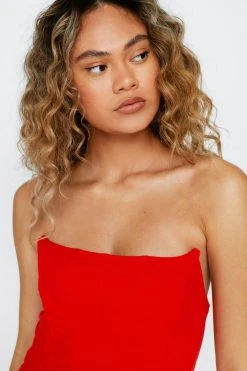Corset the bar high. This dress features a bandeau, bodycon, mini silhouette, corset design throughout, boning detailing, and zip closure at back. Style with barely there heels and a kickass shoulder bag. Model is 5’8″ and wears a US size 6/UK size 10.