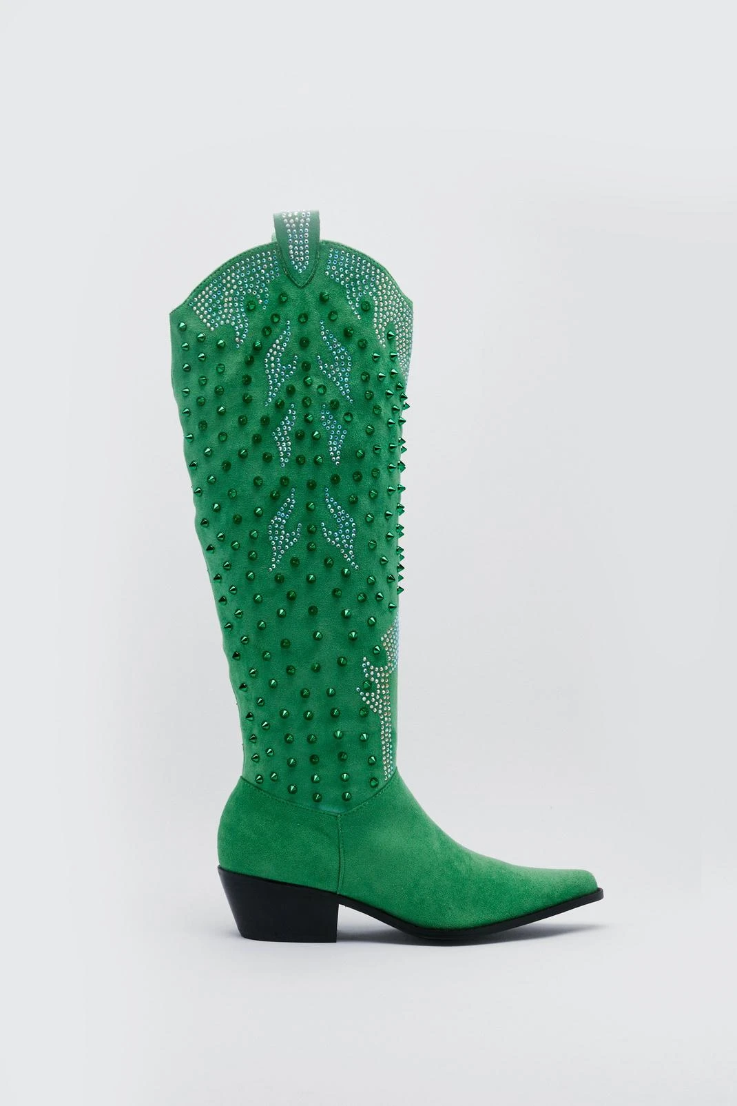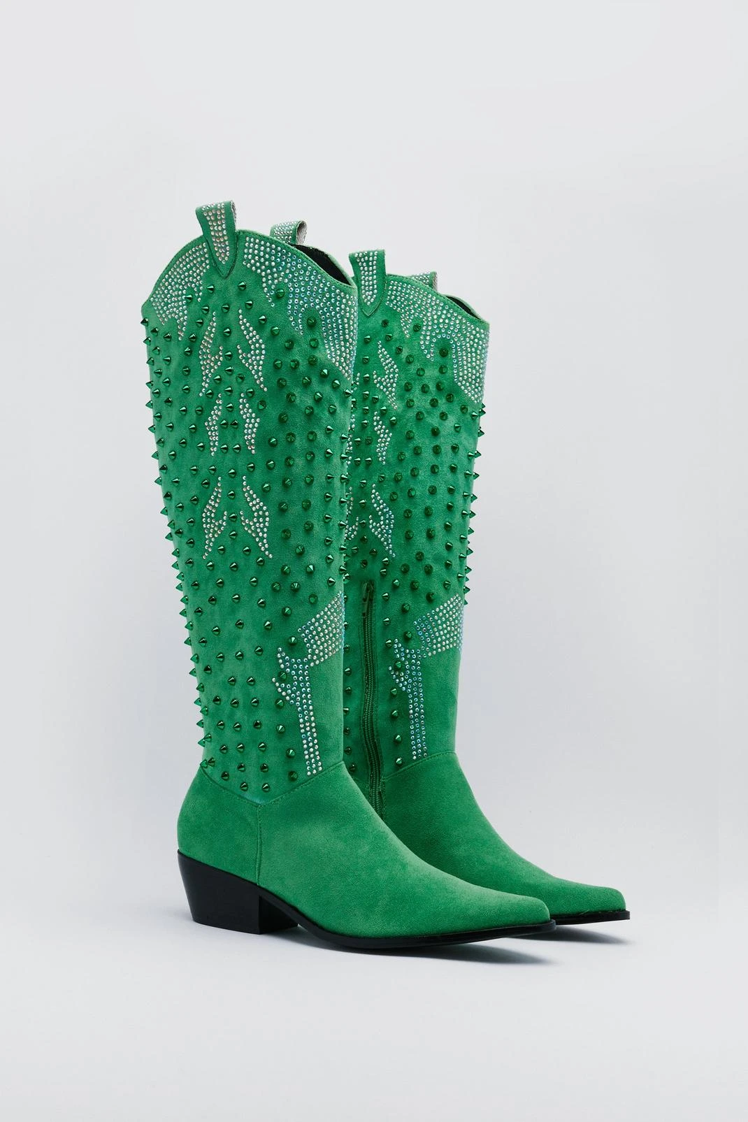Heading to the barn dance. Feel fierce in our cowboy boots, made in high quality faux suede fabric, featuring statement studded accents and an eye catching knee high length. Pairs well with jeans and skirts for footwear that will take you from festivals and gig nights to happy hour and date nights.