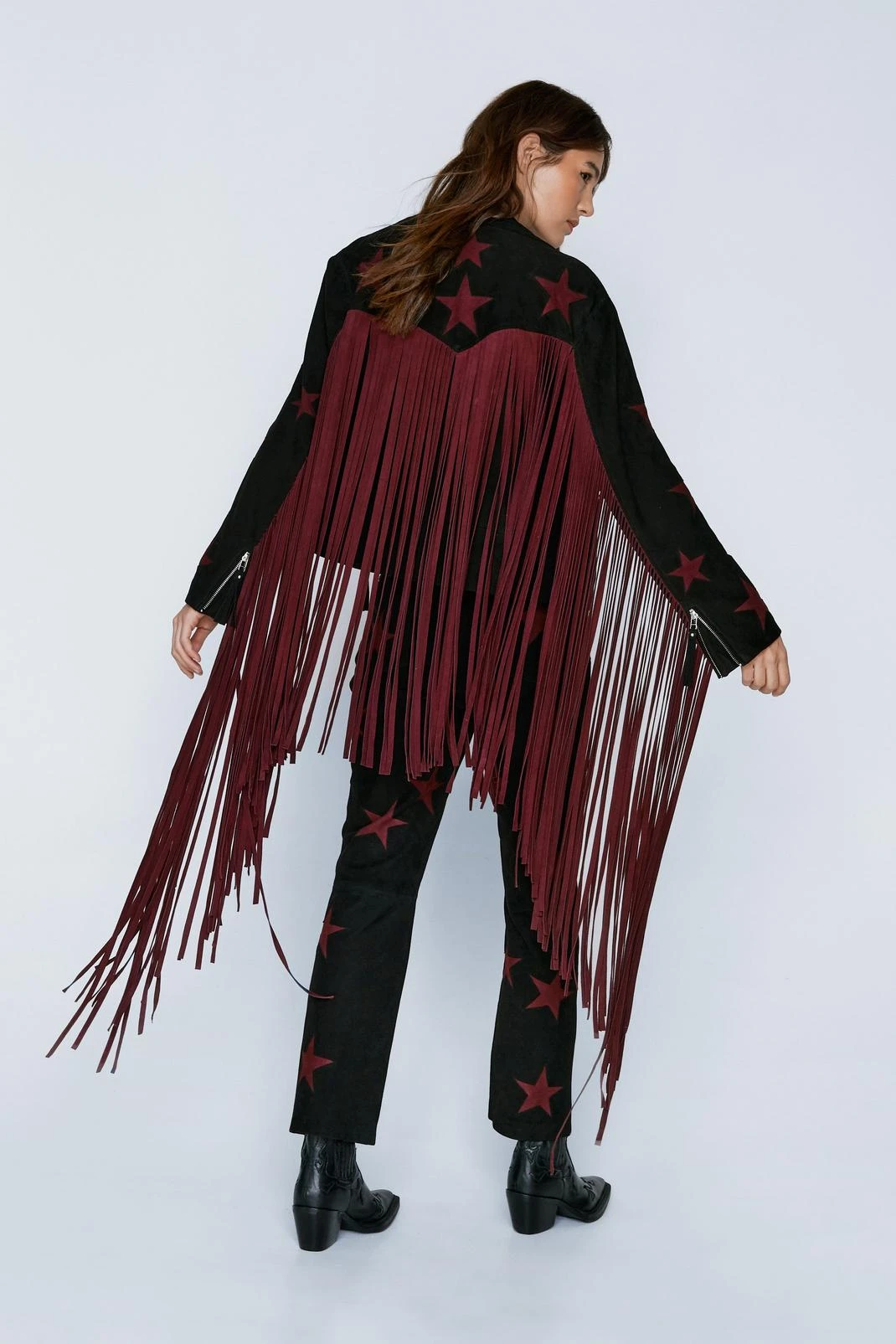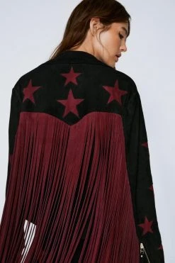 Demand attention. Feel edgy when you step out in our biker jacket, made in a high quality suede fabric, with star detailing and statement long fringe. Pairs well with all the leather and denim in your closet for a look that will take you from festival weekends to happy hours.