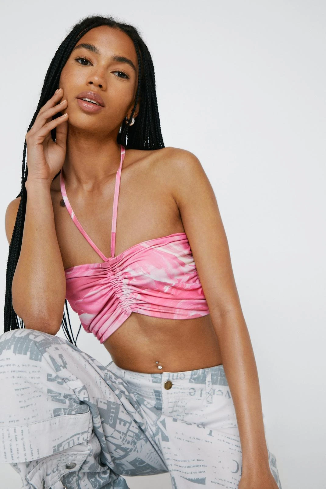 Show a little skin. Style with newspaper print pants, and flatform thong sandals.