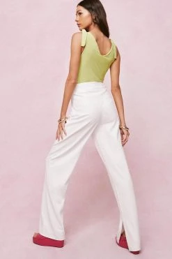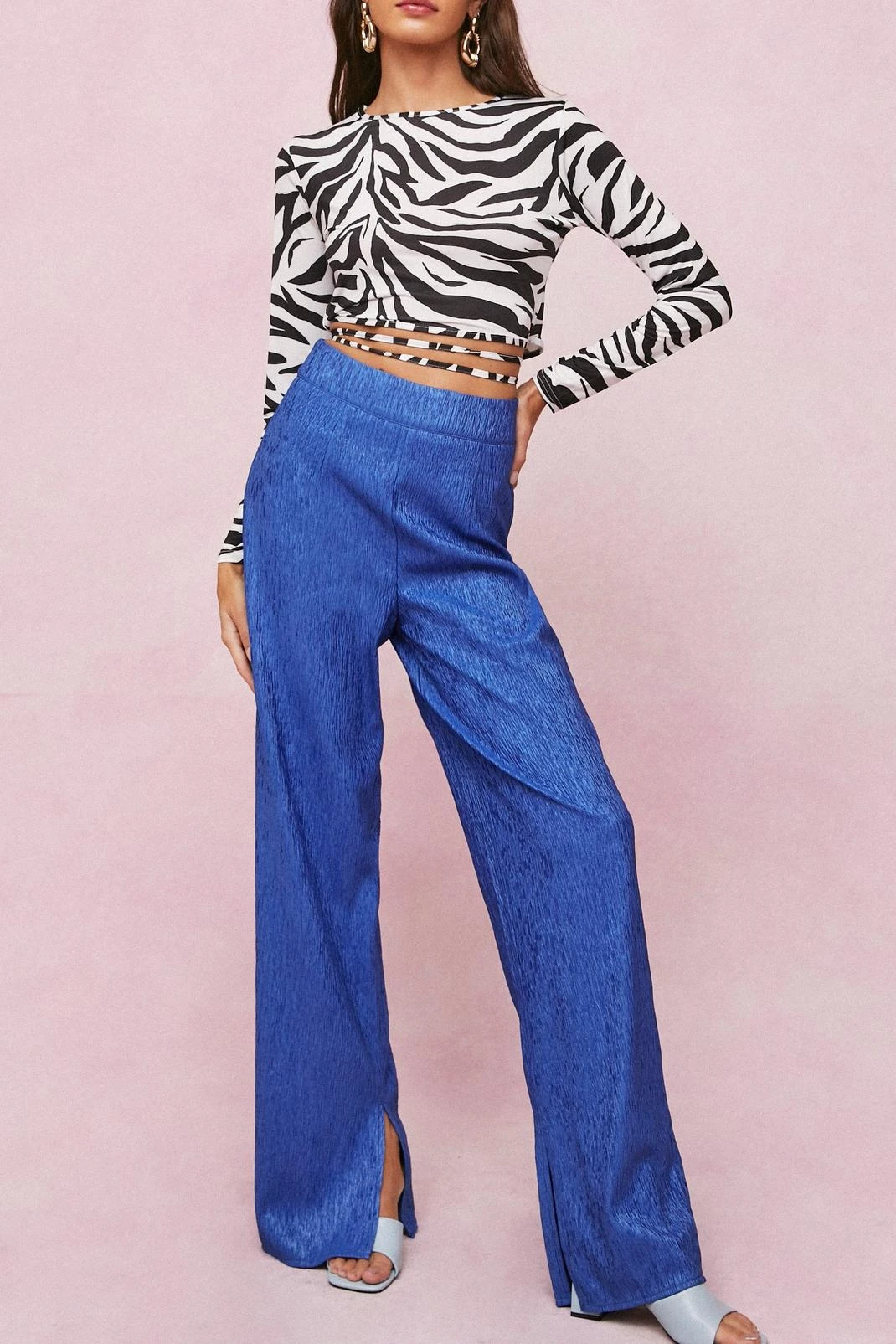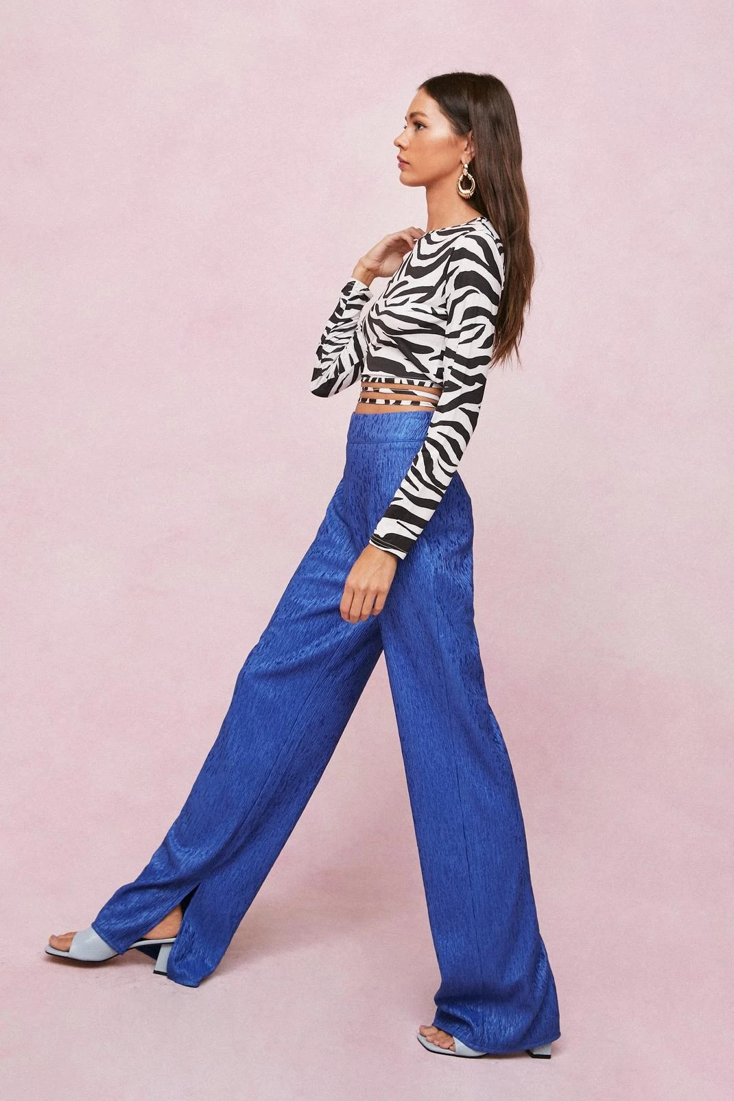 We wear the pants in the relationship. These pants come in a textured fabric and feature a high waisted, straight leg silhouette, splits at hem, zip closure, dart detailing, and jacquard design throughout. Rock with a bodysuit or animal print crop top for whatever plans you’ve got going down.