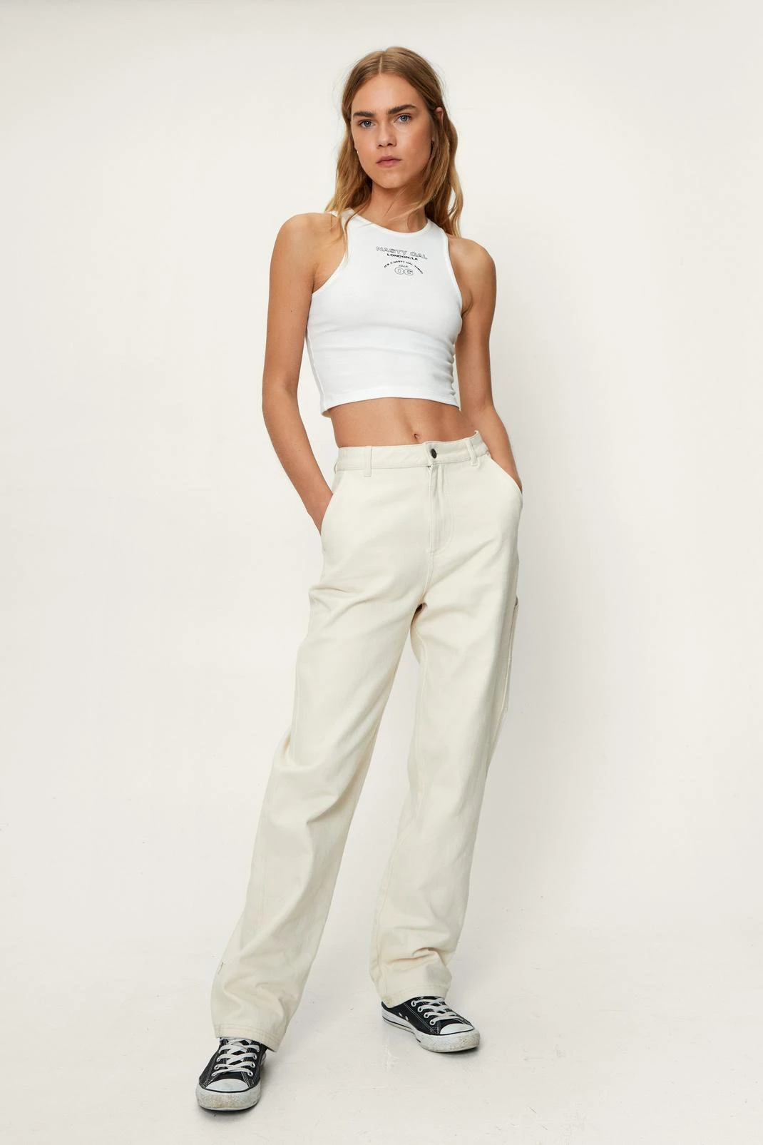 Style yours with a cowl neck crop top and chunky sneakers.