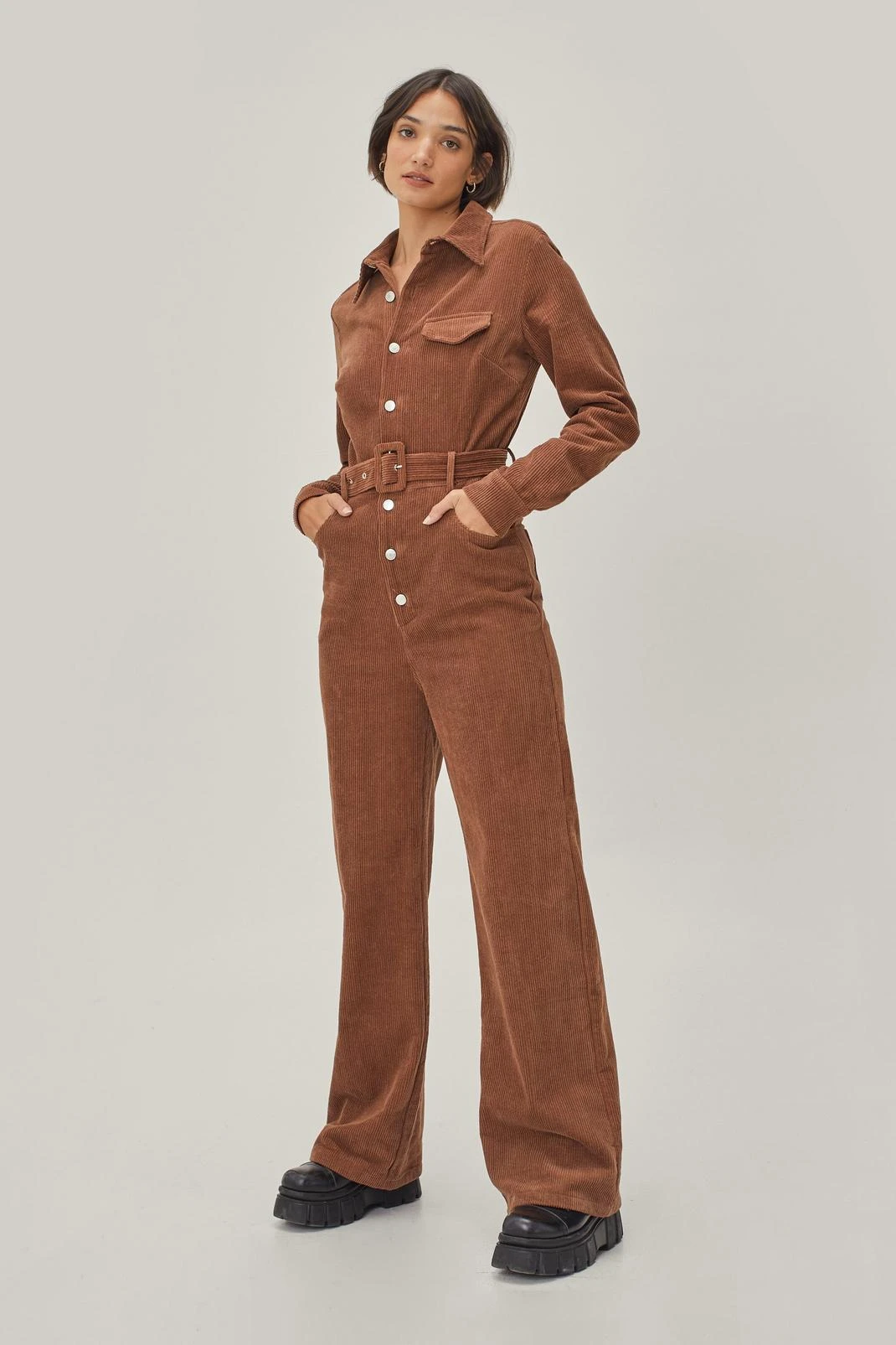 One and done kinda thing. This premium jumpsuit comes in a thick, soft corduroy and features a relaxed, wideleg silhouette, contrasting button fastenings, a matching buckle belt with belt loops, utility style pockets, and full length, cuffed sleeves. Style with biker boots and some chunky jewelry.