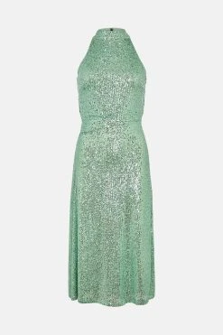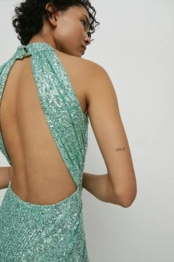 - Warehouse Sequin Halter Drape Back Midi Dress